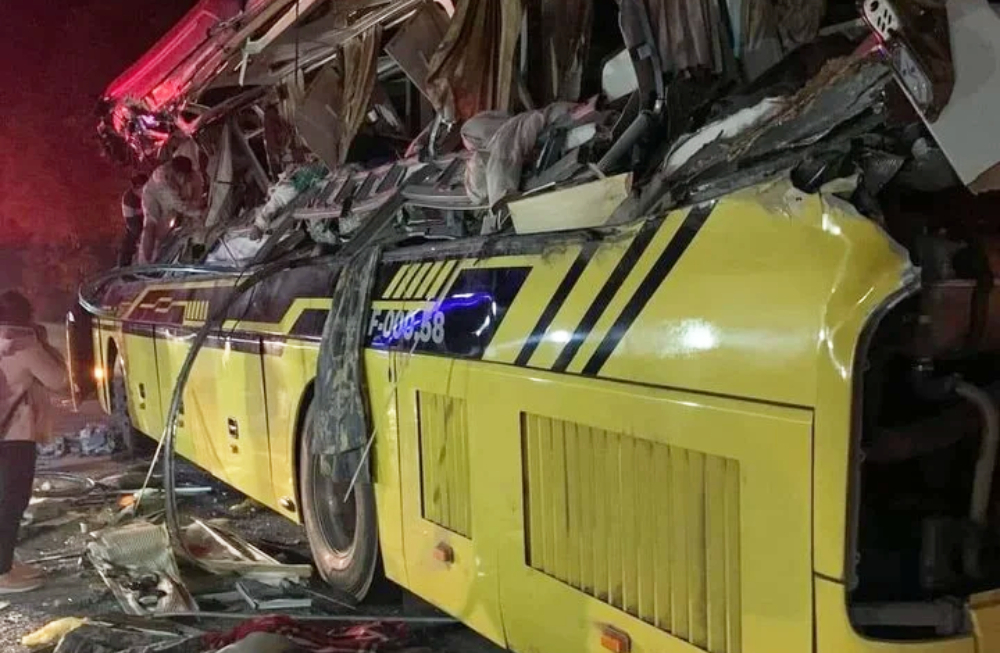 Tại hiện trường, cả 2 phương tiện hư hỏng nặng, xe khách biến dạng.