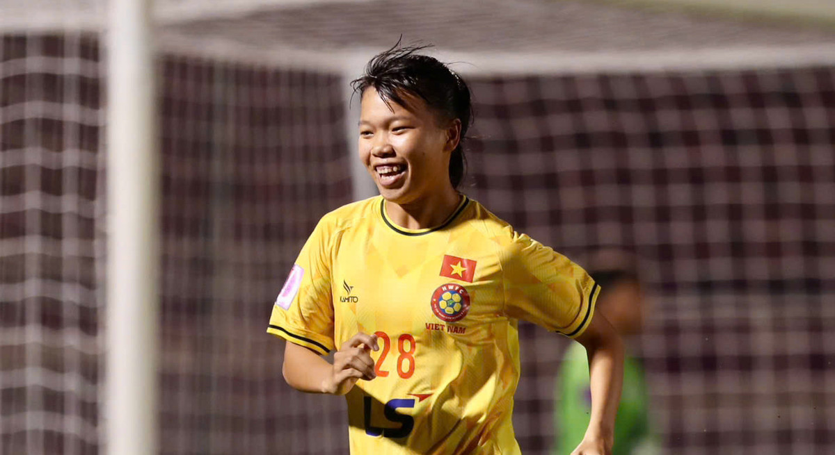 Nguyễn Thị Kim Yên không giấu nổi niềm vui khi có bàn thắng.