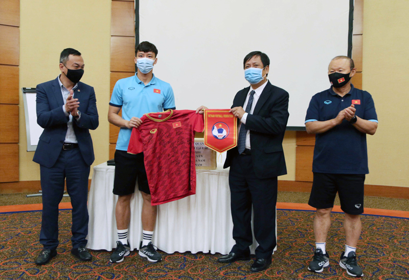 Đội trưởng Quế Ngọc Hải đại diện các cầu thủ đội tuyển tặng áo thi đấu, cờ lưu niệm cho Đại sứ Nguyễn Mạnh Tuấn.