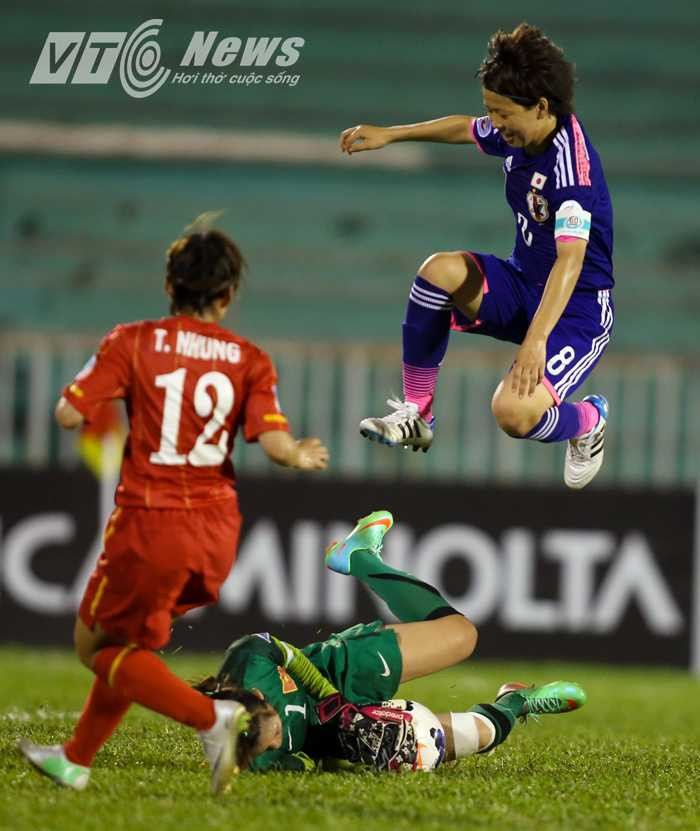 52': ĐÁNH ĐẦU... Kawasumi Naohomi vừa bật cao đánh đầu sau đường tạt bóng bên cánh phải của đồng đội. Rất may bóng lại đi chệch khung thành Kiều Trinh. Ở tình huống này, lợi thể về thể hình đã giúp Kawasumi chiến thắng trung vệ Chương Thị Kiều của Việt Nam.