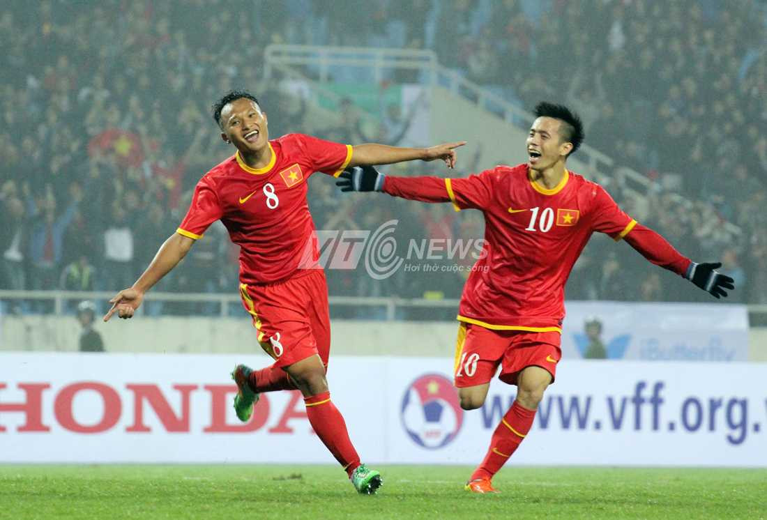 Anh Đức (11) và Quốc Anh (12) cùng lập công giúp đội tuyển Việt Nam thắng trận. (Ảnh: Hà Thành)