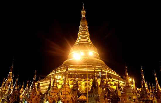 Chùa vàng Shwegadon lộng lẫy và uy nghi trong không gian buổi tối.