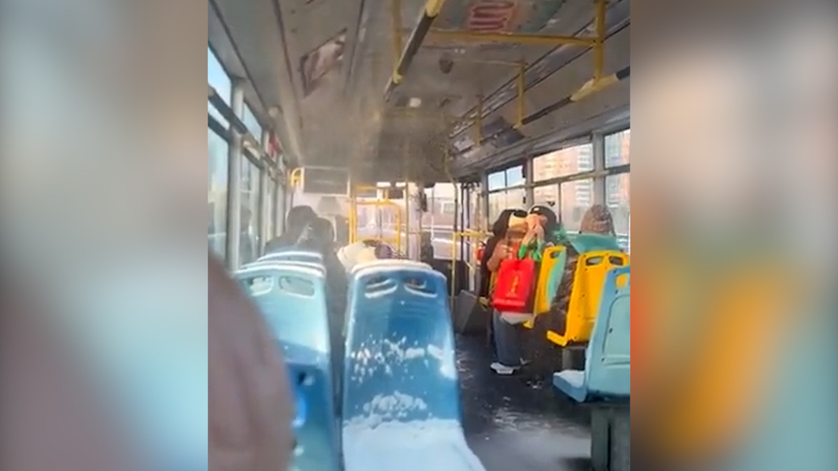 Hệ thống máy lạnh của xe buýt bị hỏng khiến 'tuyết' rơi đầy bên trong xe, ghế ngồi và hành khách đều bị bao phủ.