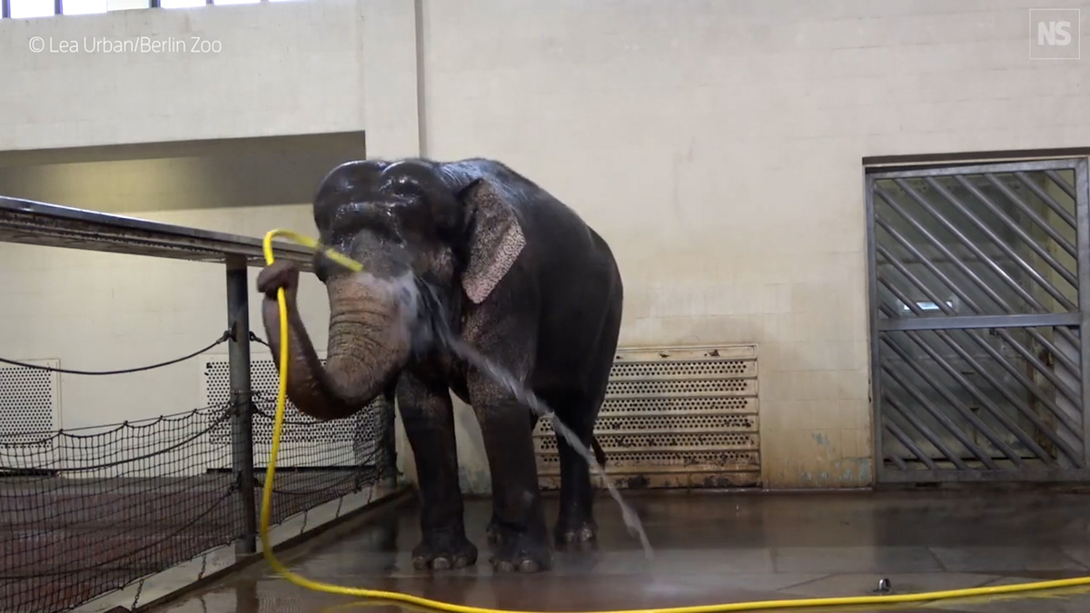 Chú voi châu Á thể hiện kỹ năng tự tắm bằng vòi phun một cách thành thục trong vườn thú ở Đức khiến nhiều người thích thú.