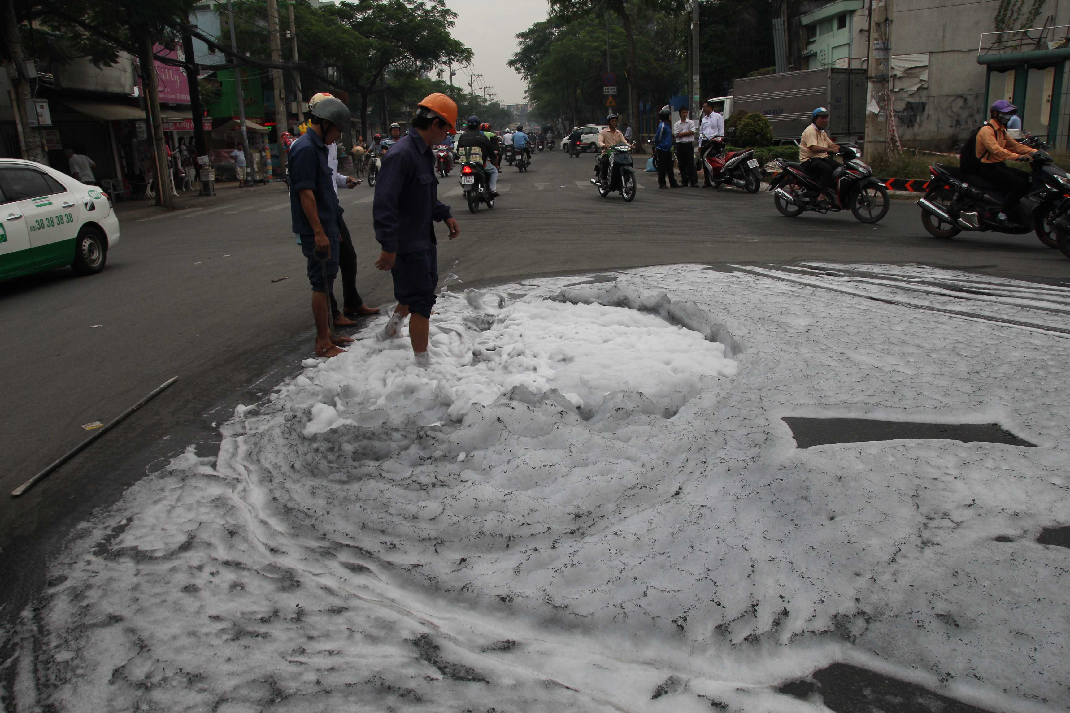 Sự xuất hiện của lớp bọt trắng xóa như tuyết ngay tại vị trí ngã ba trên đã gây ảnh cản trở giao thông nghiêm trọng. Nhiều phương tiện di chuyển qua khu vực phải đánh lái né tránh để không bị trượt ngã.