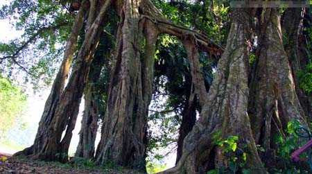 | Một góc của thân cây sanh Suối Cốc với những trân trụ vạm vỡ vun lên thành một ngọn |