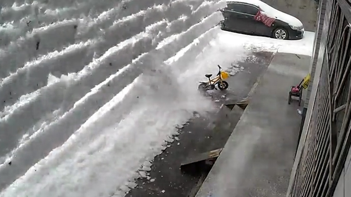 Người phụ nữ tại tỉnh Hồ Bắc, Trung Quốc đang dọn dẹp tuyết bất ngờ bị những khối tuyết từ trên mái nhà rơi xuống đè trúng.