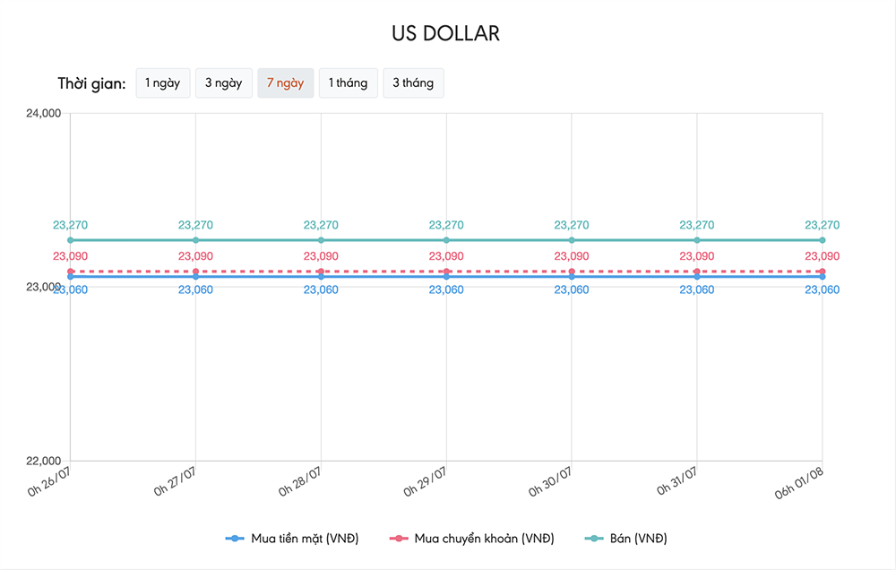 Tỷ giá USD tại một số ngân hàng thương mại lớn đang giao dịch quanh mức 23.090 - 23.270 đồng/USD. Vietcombank và BIDV niêm yết tỷ giá ở mức: 23.090 đồng/USD và 23.270 đồng/USD. Vietinbank: 23.083 đồng/USD và 23.263 đồng/USD.