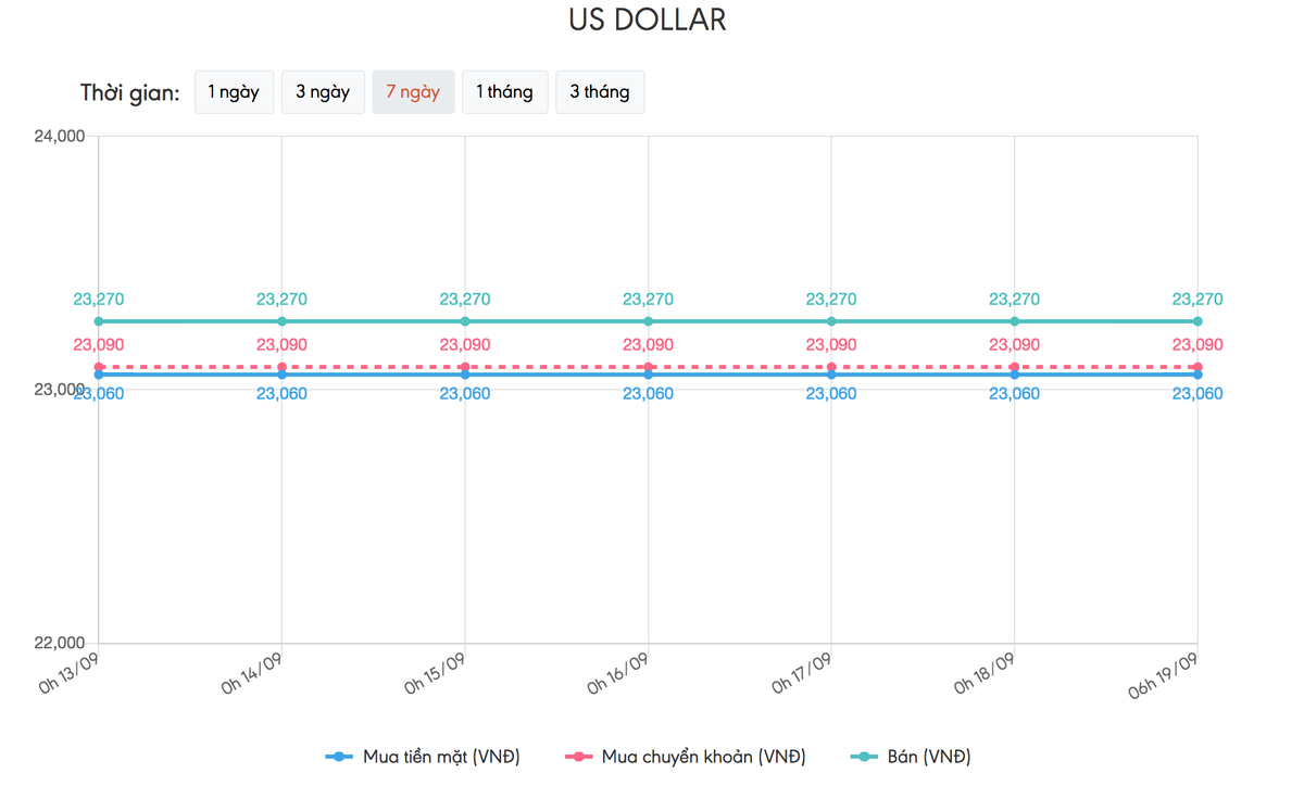 Tỷ giá USD tại Vietcombank, Vietinbank được niêm yết không đổi ở mức: 23.090 đồng/USD và 23.270 đồng/USD (mua vào - bán ra). BIDV niêm yết tương ứng ở mức 23.090 đồng/USD và 23.270 đồng/USD không đổi so với chốt phiên ngày hôm trước.