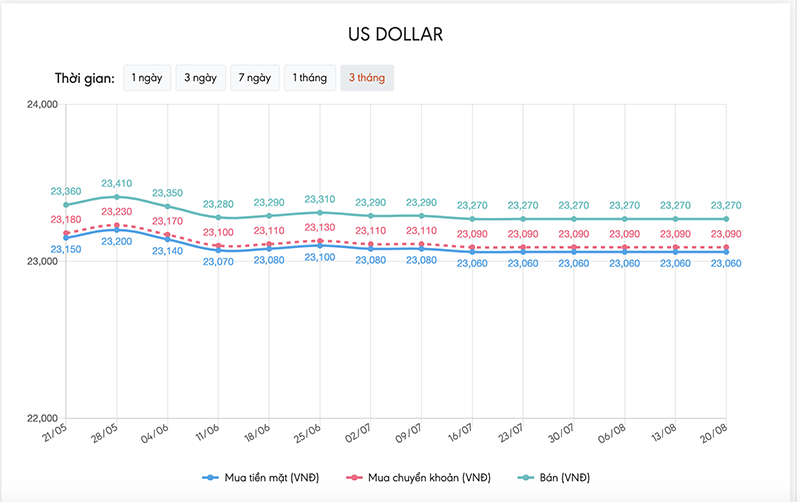 Tỷ giá USD hôm nay 20/8 tiếp tục duy trì ở mức thấp.