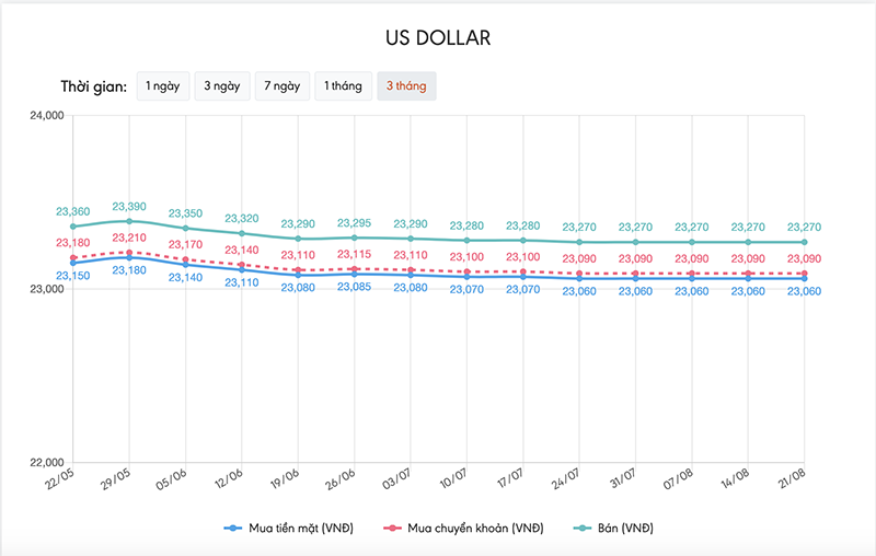Chốt phiên giao dịch 21/8, Vietcombank giữ mức niêm yết tỷ giá là: 23.060 - 23.270 đồng/USD (mua - bán). Giá giao dịch tại Vietinbank lần lượt là: 23.076 đồng/USD và 23.266 đồng/USD (tăng 3 đồng cả hai chiều mua vào bán ra). BIDV niêm yết giá USD không đổi ở mức 23.085 - 23.265 đồng/USD.