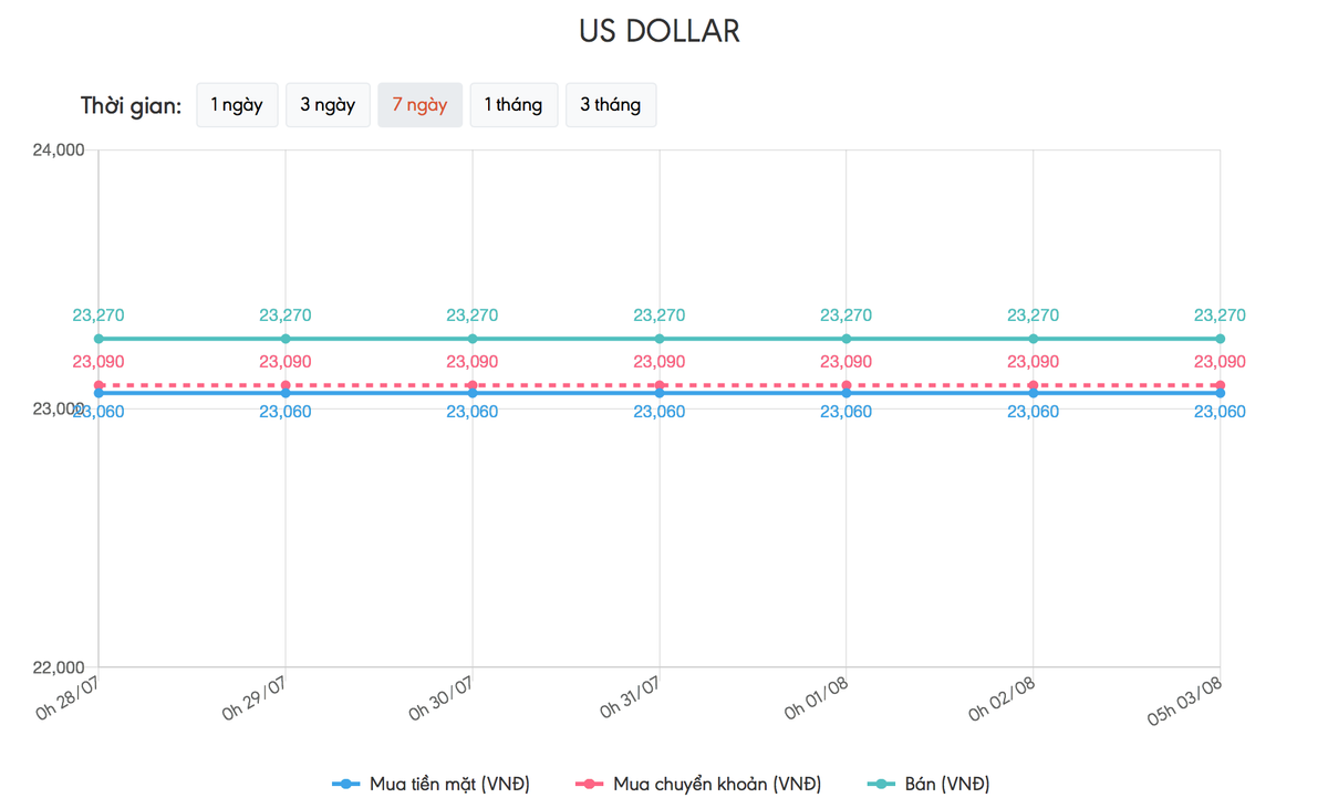 Vietcombank và BIDV niêm yết tỷ giá ở mức: 23.090 đồng/USD và 23.270 đồng/USD. Vietinbank: 23.083 đồng/USD và 23.263 đồng/USD. ACB: 23.110 đồng/USD và 23.260 đồng/USD.