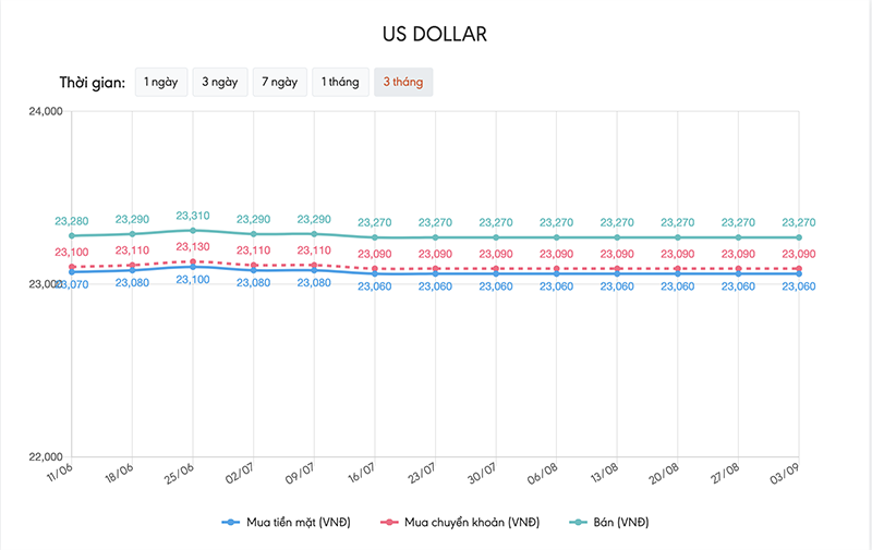 Vietcombank có mức niêm yết tỷ giá là: 23.060 - 23.270 đồng/USD (mua - bán). Giá giao dịch tại Vietinbank lần lượt là: 23.032 đồng/USD và bán ra ở mức 23.262 đồng/USD. BIDV niêm yết giá giữ nguyên ở mức USD ở mức 23.085 - 23.265 đồng/USD.