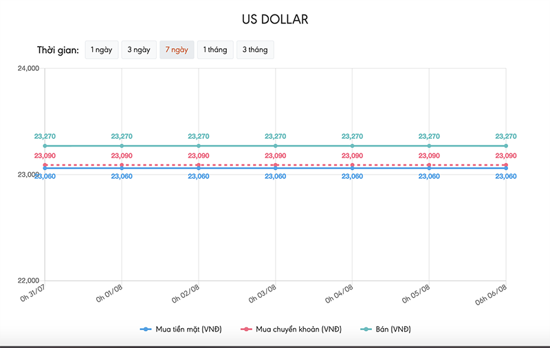 Cuối phiên giao dịch ngày 5/8, ngân hàng Vietcombank niêm yết tỷ giá ở mức: 23.090 đồng/USD mua vào và 23.270 đồng/USD bán ra. Tương tự, Vietinbank niêm yết đồng USD với giá 23.087 - 23.267 đồng/USD. BIDV là 23.085 - 23.265 đồng/USD.