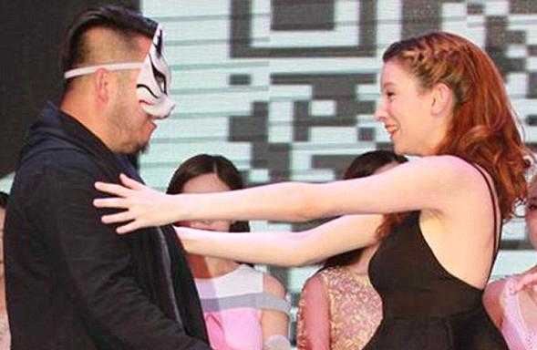 | Rola Misaki ôm lấy một người đàn ông đang đeo một chiếc mặt nạ, được cho là vị tỷ phú đã thuê cô tại một sự kiện gần đây ở Bắc Kinh |