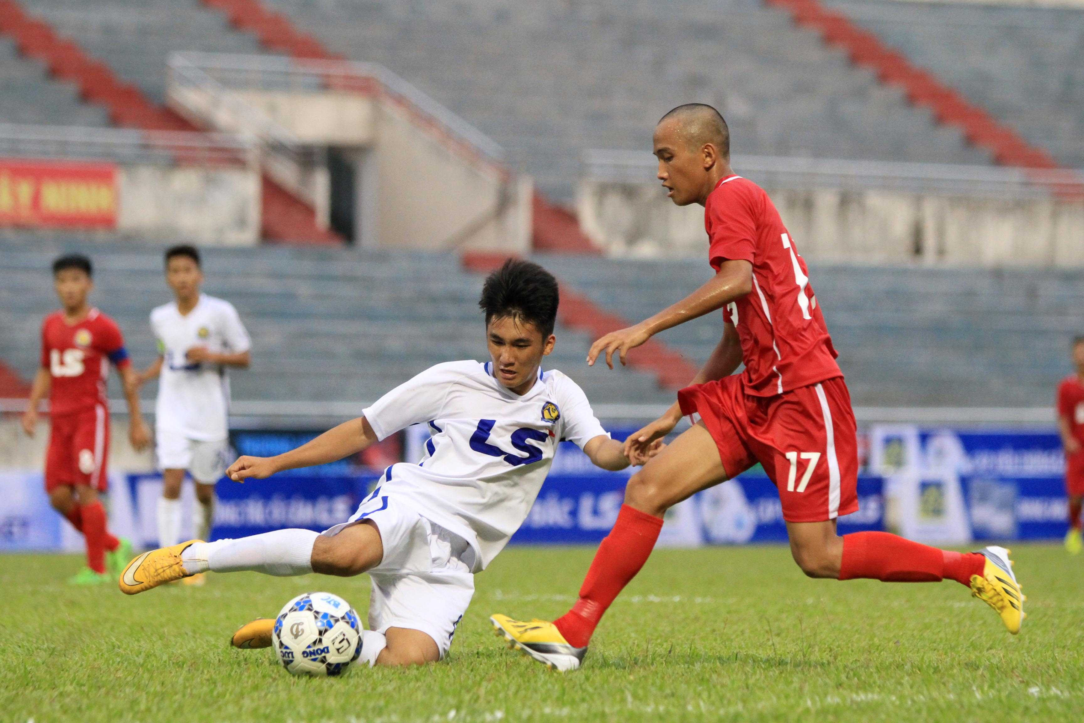 Các trọng tài điều hành VCK giải U17 Quốc gia khá nghiêm khắc với các pha phạm lỗi ác ý (Ảnh: H.Tùng)