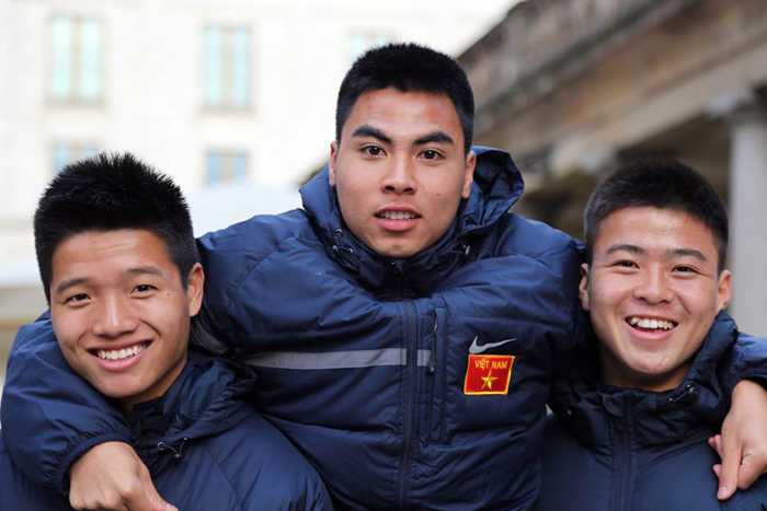 (Từ trái sang) Các cầu thủ Anh Tài, Hồng Duy, Văn Sơn chụp ảnh cùng hướng dẫn đoàn