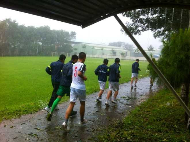 Thời tiết tại Pleiku không ủng hộ thầy trò HLV Graechen khi buổi tập sáng nay trời mưa tầm tã. Tuy nhiên vị HLV người Pháp cùng các học trò vẫn hoàn thành bài tập vận động với việc đội mưa chạy nhiều vòng quanh trung tâm huấn luyện. Chiều nay, toàn đội bước vào buổi tập với bóng trong sân cỏ nhân tạo có mái che.