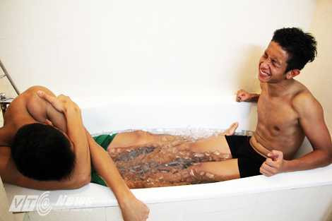 (VTC News) - Sau khi xả stress ngoài bể bơi, các cầu thủ U19 Việt Nam bước vào màn "hành xác" với việc phải ngâm mình vào bồn nước đá.