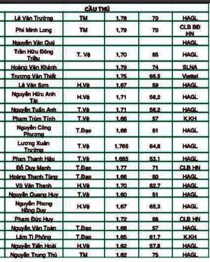Bảng chiều cao, cân nặng của U19 Việt Nam cách đây không lâu.