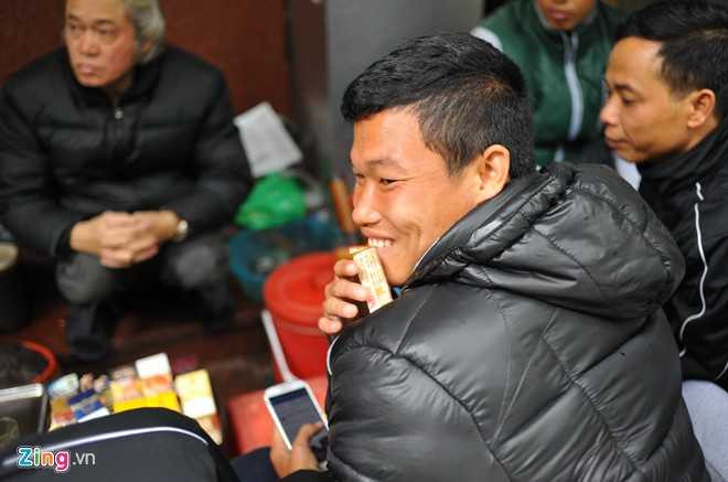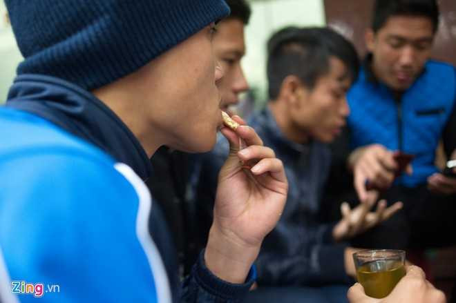 Cầu thủ U19 Việt Nam uống trà nóng và ăn kẹo lạc giản dị bên vỉa hè.