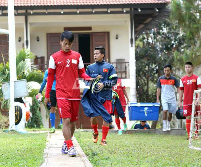 Hậu vệ cánh Lê Xuân Sơn cùng đồng đội ra sân tập