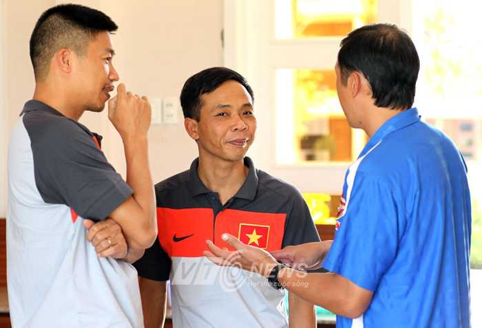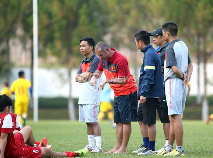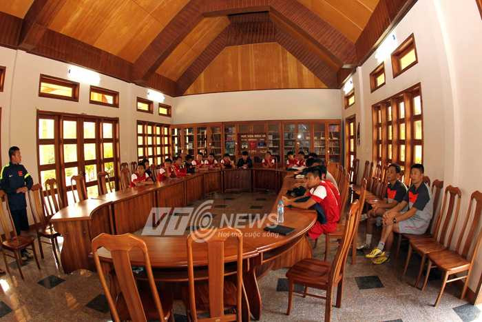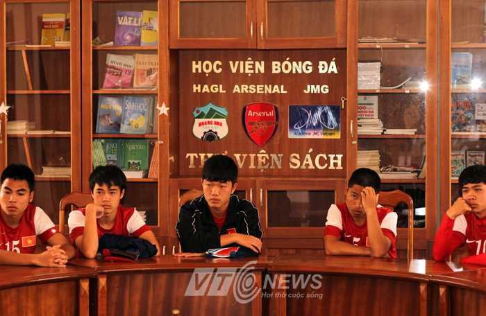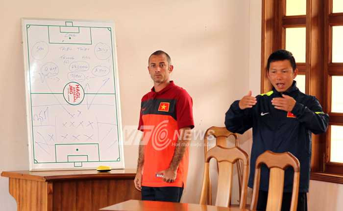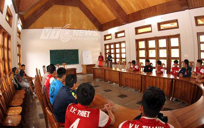Còn đây là bài giảng về chiến thuật. Trợ lý ngôn ngữ Nguyễn Hữu Trí đang truyền đạt lại bằng tiếng Việt cho một số cầu thủ vốn không thuộc Học viện HAGL-Arsenal JMG và không hiểu được tiếng Pháp.