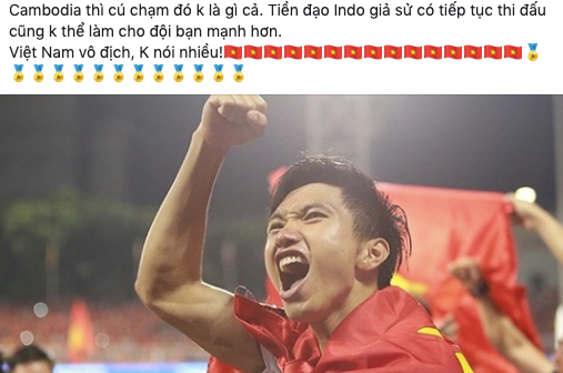 Người hâm mộ Indonesia cũng không nên trách chửi Văn Hậu vì các bạn nên bình tĩnh mà thấy rằng, một cầu thủ linh hồn của Việt Nam như Dimas cũng ngồi ngoài cả hai trận sinh tử chính là Quang Hải. Vậy tại sao Việt Nam chiến thắng với tỉ số không thể chối cãi 3-0?