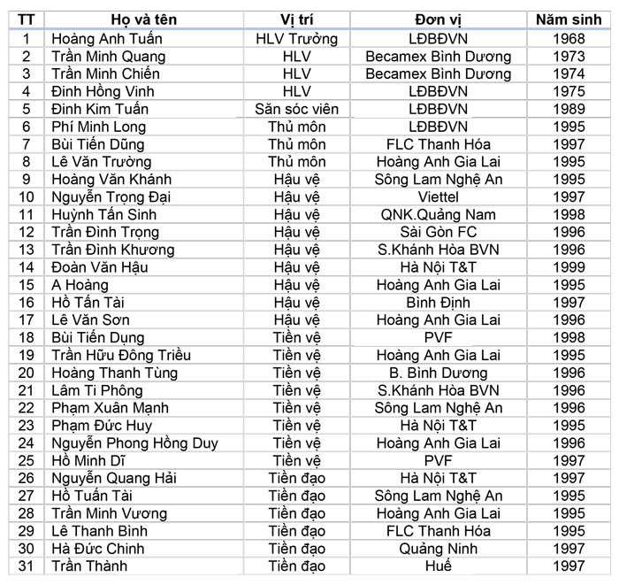 Đó là thủ thành Bùi Tiến Dũng, hậu vệ đội trưởng Nguyễn Trọng Đại, Huỳnh Tấn Sinh, Đoàn Văn Hậu, Hồ Tấn Tài, tiền vệ Bùi Tiến Dụng, Hồ Minh Dĩ, tiền đạo Nguyễn Quang Hải, Hà Đức Chinh và Trần Thành.