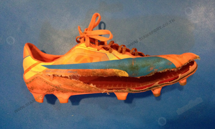 | Hình ảnh chiếc giày bị rách của tiền đạo tiền đạo Chayawat Sirnawong |