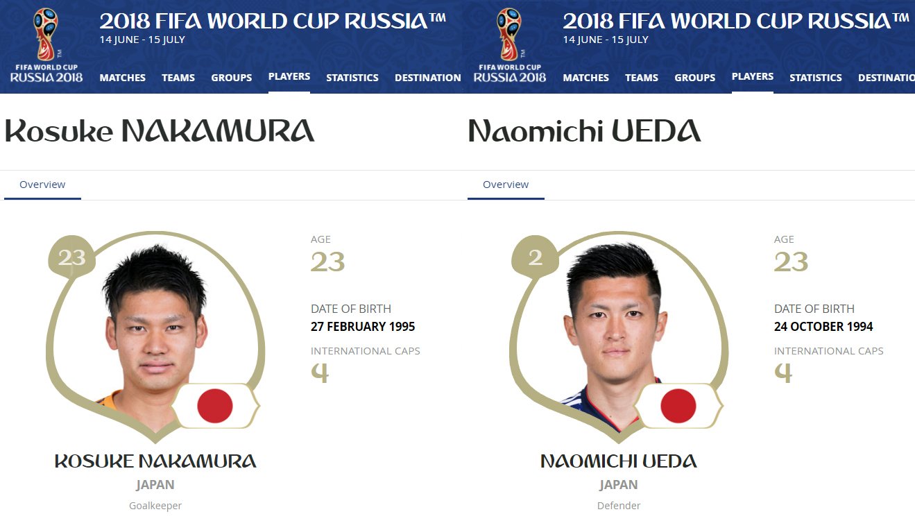 Trong thành phần 23 cầu thủ dự World Cup 2018 của đội tuyển Nhật Bản có 2 cầu thủ ở độ tuổi 23 là thủ thành Kosuke Nakamura và hậu vệ Ueda Naomichi.
