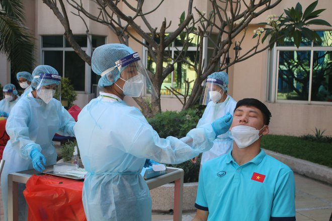 Nhân viên y tế của ban tổ chức lấy mẫu xét nghiệm cho U23 Việt Nam vào sáng 19/2. Ảnh: VFF.
