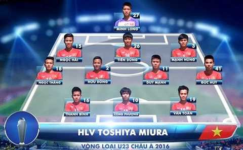 U23 Việt Nam: Minh Long, Tiến Dũng, Hữu Dũng, Mạnh Hùng, Duy Mạnh, Ngọc Hải, Đức Huy, Văn Toàn, Ngọc Thắng, Thanh Bình, Công Phượng.