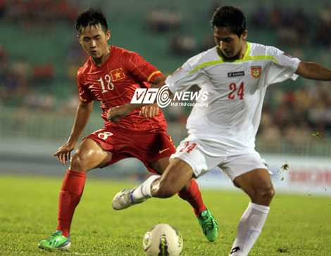 49' KHÔNG VÀO... Vũ Minh Tuấn vừa có một pha kết thúc cận thành hết lực bằng chân trái nhưng bóng đi vọt xa đầy tiếc nuối. Đó là một pha vuốt bóng sau khi tiền vệ của Than Quảng Ninh tâng bóng qua đầu một trung vệ U23 Myanmar.