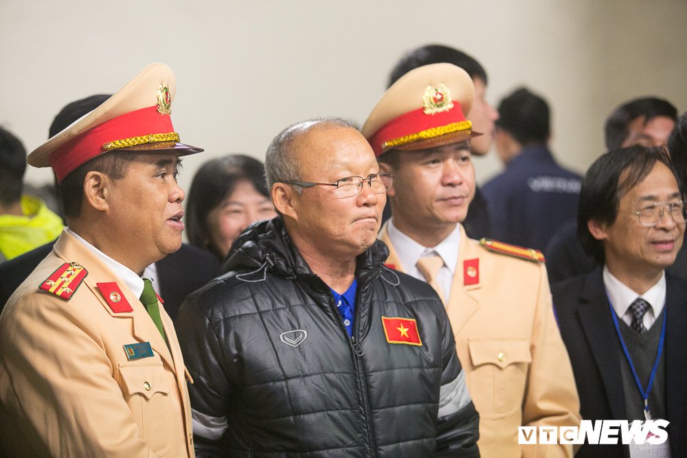 HLV Park Hang Seo vui vẻ chụp hình cùng các cảnh sát giao thông. (Ảnh: Hồng Nam)