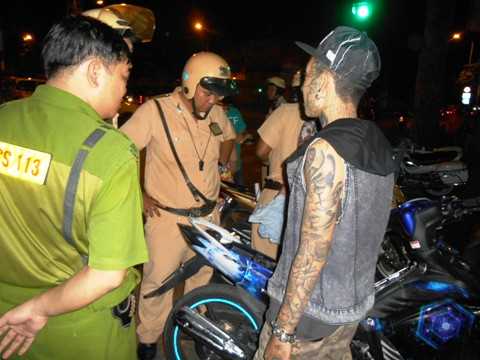 Ngoài ra, cảnh sát còn phát hiện nhiều thanh niên xăm mình, mang “hàng nóng”. Cụ thể, đối tượng Thạch Văn Lượm (sinh năm 1992, quê tỉnhTrà Vinh) lái xe máy, trong cốp xe BKS 59G1 – 288.09 có chứa 1 côn ba khúc bằng inox.