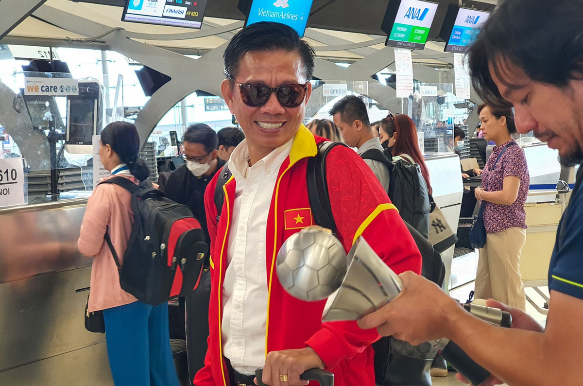 Ông Dương Nghiệp Khôi - Tổng Thư ký Liên đoàn bóng đá Việt Nam (VFF) ra sân bay đón đội. Khoảng 14h30, sau khi làm thủ tục nhập cảnh và di chuyển hành lý, HLV Hoàng Anh Tuấn và các cầu thủ nhanh chóng ra xe buýt để về trụ sở VFF tham dự lễ mừng công.