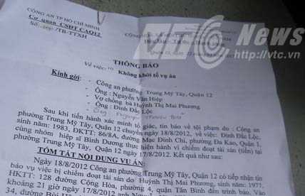 Thông báo này do Thượng tá Nguyễn Văn Liêm – Phó thủ trưởng Cơ quan CSĐT CAQ.12 ký ngày 22/1/2013: Căn cứ Điều 108 Bộ luật tố tụng hình sự nước CHXHCN Việt Nam, Cơ quan CSĐT CAQ.12, ra quyết định không khởi tố vụ án hình sự số 13/QĐ.