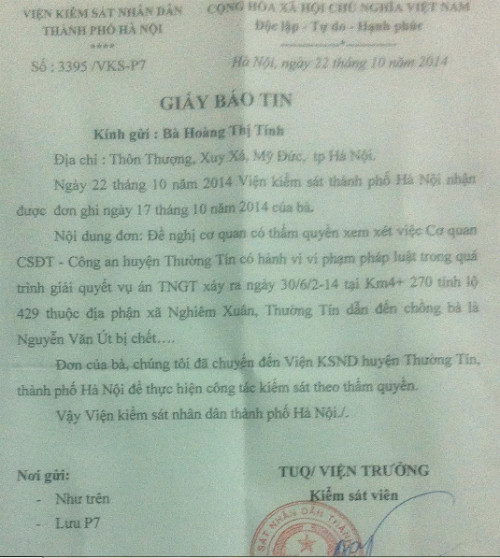 Viện Kiểm sát Nhân dân TP Hà Nội cũng có văn bản đề nghị Viện Kiểm sát huyện Thường Tín thực hiện công tác Kiểm sát theo thẩm quyền. Huyện ủy huyện Thường Tín cũng đã chuyển đơn và đề nghị Viện Kiểm sát, Công an huyện Thường Tín xem xét và trả lời chị Tính.