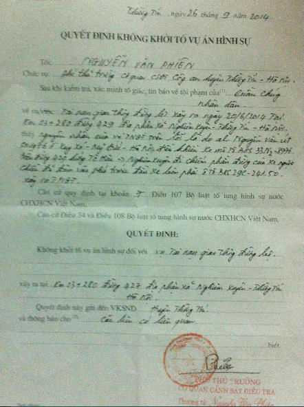 “Kiểm sát viên của tôi nói rằng đã nhận được Quyết định không khởi tố vụ án hình sự của Cơ quan CSĐT. Tuy nhiên, tôi chưa được xem Quyết định đó, đây là lần đầu tiên tôi nhìn thấy văn bản này,” ông Tuấn nói.