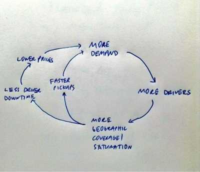 | Bản vẽ minh họa vòng tuần hoàn về sức cung và sức cầu tác động lẫn nhau bởi những lợi ích xuất hiện trong quá trình hoạt động của Uber |