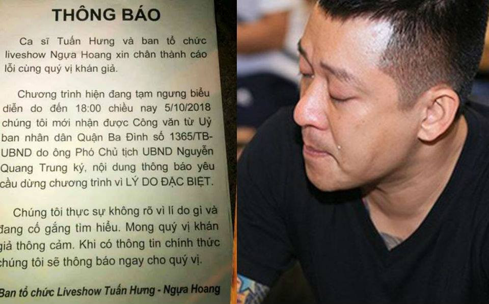 Vào tối 5/10, UBND quận Ba Đình ra thông báo tạm hoãn liveshow kỷ niệm 20 năm ca hát của Tuấn Hưng vào phút chót vì "lý do đặc biệt".