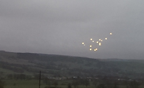 Chúng bay theo chùm và chao lượn tự do trên không trung, phóng to bức ảnh cho thấy có tổng cộng 15 đốm lửa sáng. Khối lửa bay qua sau ngọn đồi tại khu vực rồi bỗng nhiên biến mất.