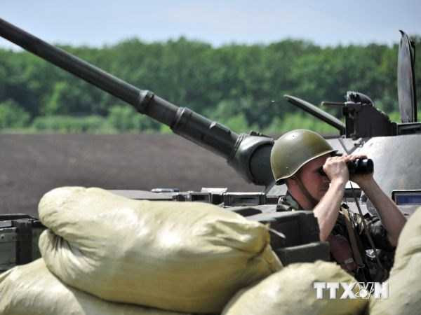 | Binh sỹ Ukraine gác tại tuyến đường từ Izyum tới Slavyansk, miền đông Ukraine |