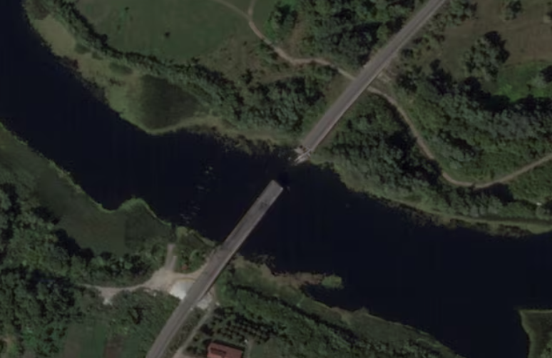 Hình ảnh vệ tinh cho thấy một cây cầu bắc qua sông Seym ở bị sập sau cuộc không kích của Ukraine tại vùng Kursk, Nga, ngày 17/8. (Ảnh: Reuters)