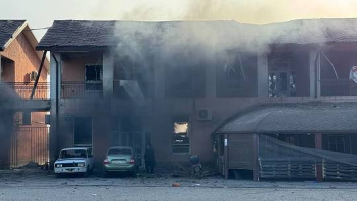 Những hình ảnh do ông Saldo cung cấp cho thấy một tòa nhà bị hư hại nặng nề và khói dày đặc bốc lên. Ở diễn biến khác, chiếc xe tải bên ngoài khu chợ bị phá hủy và bốc cháy khiến một người bị thương hoặc có thể đã tử vong.