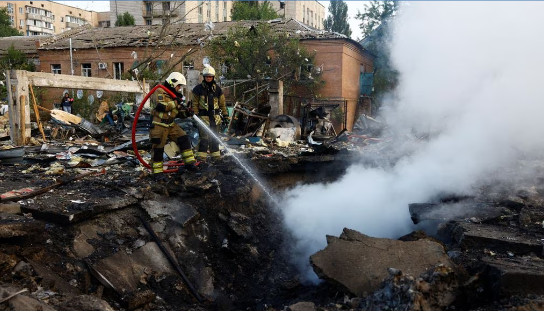 Lính cứu hỏa khống chế đám cháy tại một địa điểm trong khu dân cư ở Kiev chịu ảnh hưởng bởi cuộc không kích ngày 21/9. (Ảnh: Reuters)