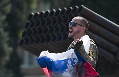 | Một tay súng ly khai cầm quốc kỳ Nga ở Donetsk hôm 24/8 (Nguồn: AP) |