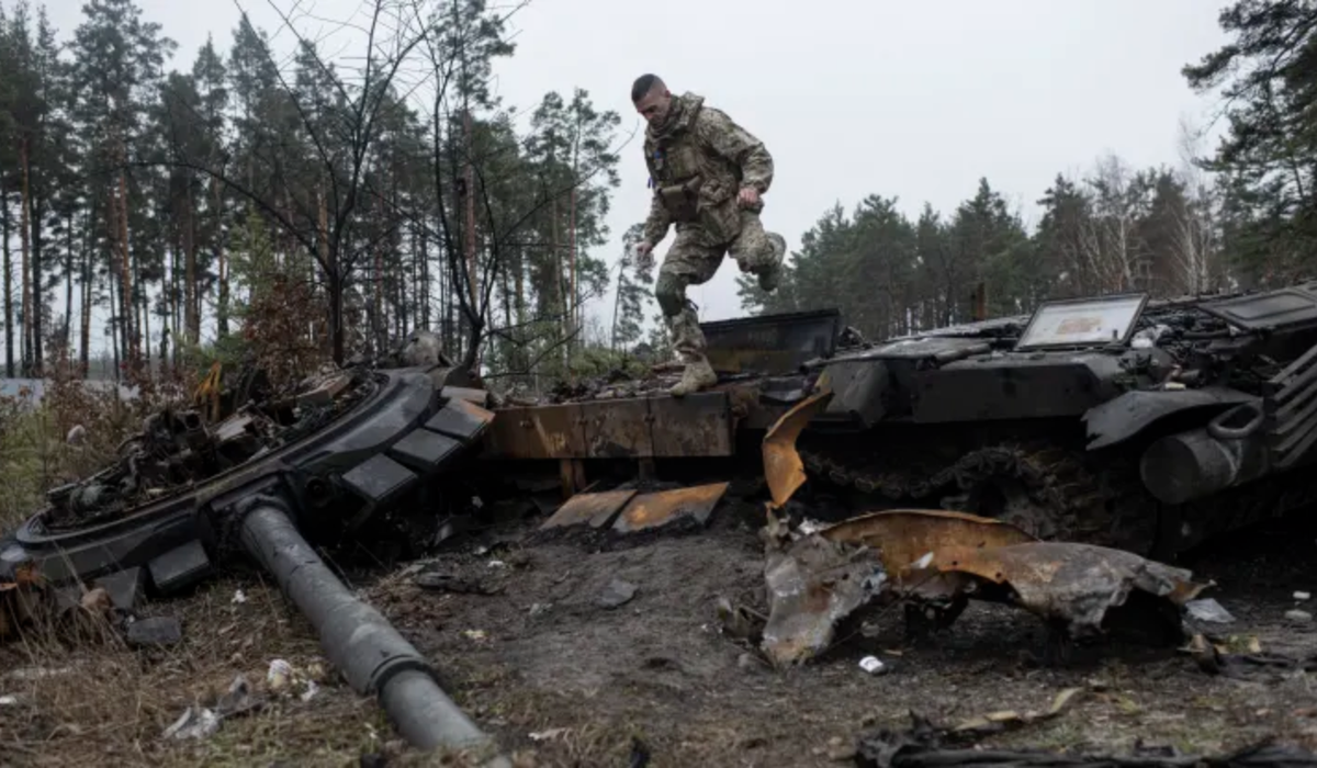 Binh sĩ Ukraine vượt qua một xác xe tăng ở Dmytrivka, ngoại ô Kiev ngày 2/4/2022. Ảnh: Getty Images