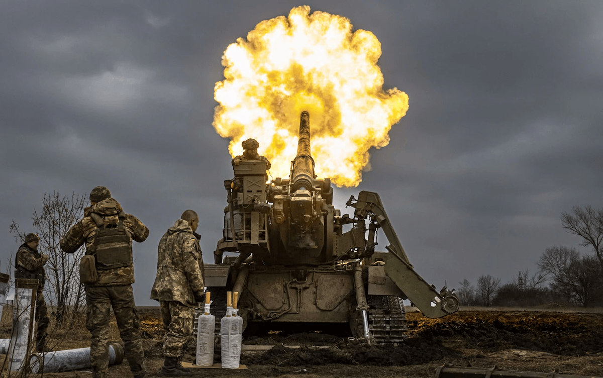 Quân Ukraine bắn đại bác vào các vị trí của Nga trên tiền tuyến gần Bakhmut. (Ảnh: Anadolu)